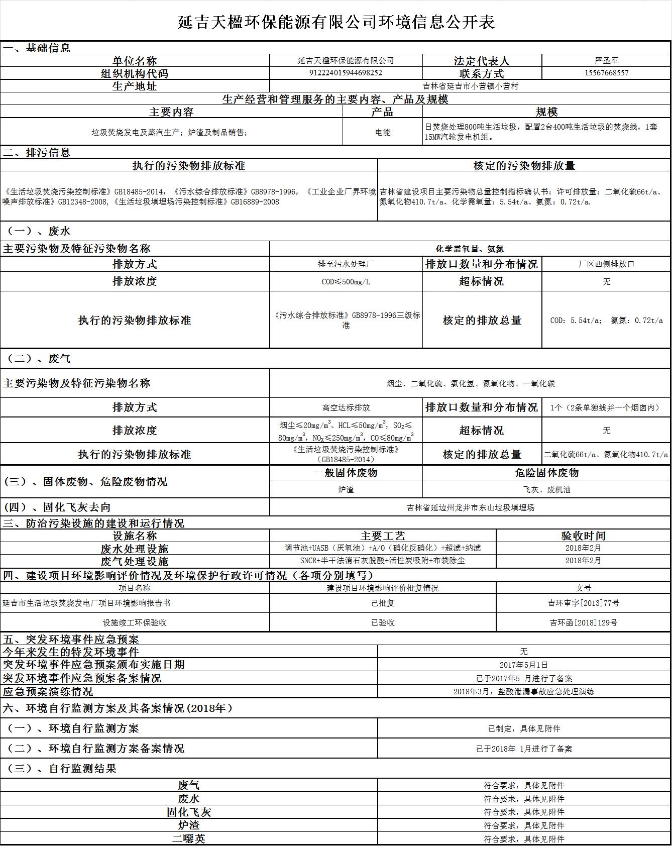延吉天楹環保能源有限公司2018年環境信息公開表